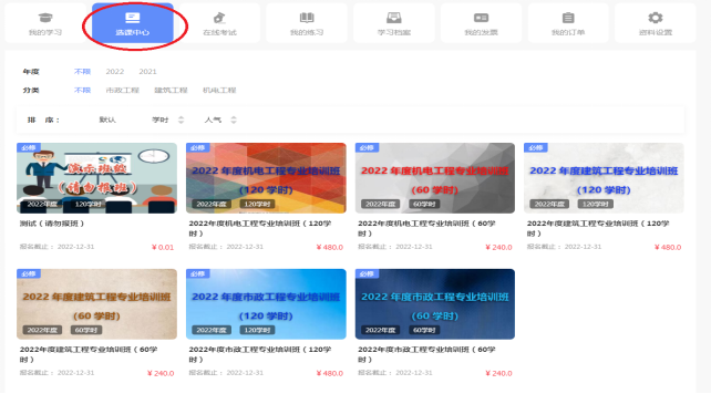 三、(1)注册完毕后,利用注册时的证件号码或者手机号登陆进入一级建造师继续教育云平台。根据需要参加继续教育的一级建造师专业进行选择课程。在选择课程时大家一定要注意:1、参加一个专业继续教育应不少于120学时,其中必修课60学时,选修课60学时,培训费480元。2、 参加两个及以上专业继续教育,每增加一个专业增加专业60学时的继续教育,其中必修课30学时,选修课30学时。每增加一个专业培训费240元。