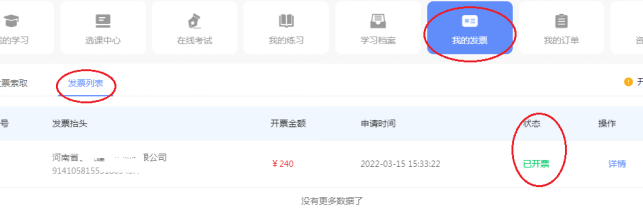 (4)交费完成后可在“我的发票”“发票列表”中查询交费订单和发票开具情况。