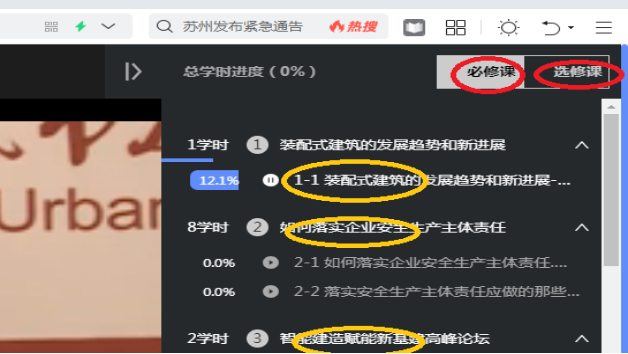 点击“必修课”“选修课”进行可以进行课程切换,点击下方的课件名称可以选择课程学习。
